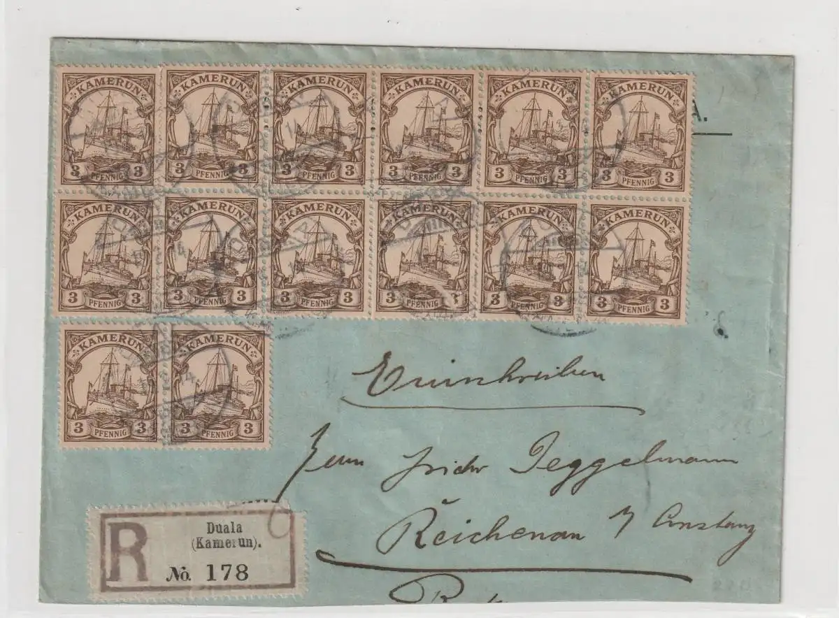 Kamerun: Einschreibbrief ab Duala mit 14 Marken a 3 Pfg.