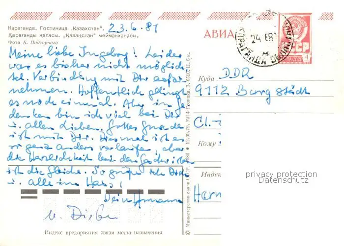 Karaganda Hotel Kazachstan Karaganda postalisch gelaufen nach 1965 Erhaltung siehe scans [DarjaD84] DarjID84