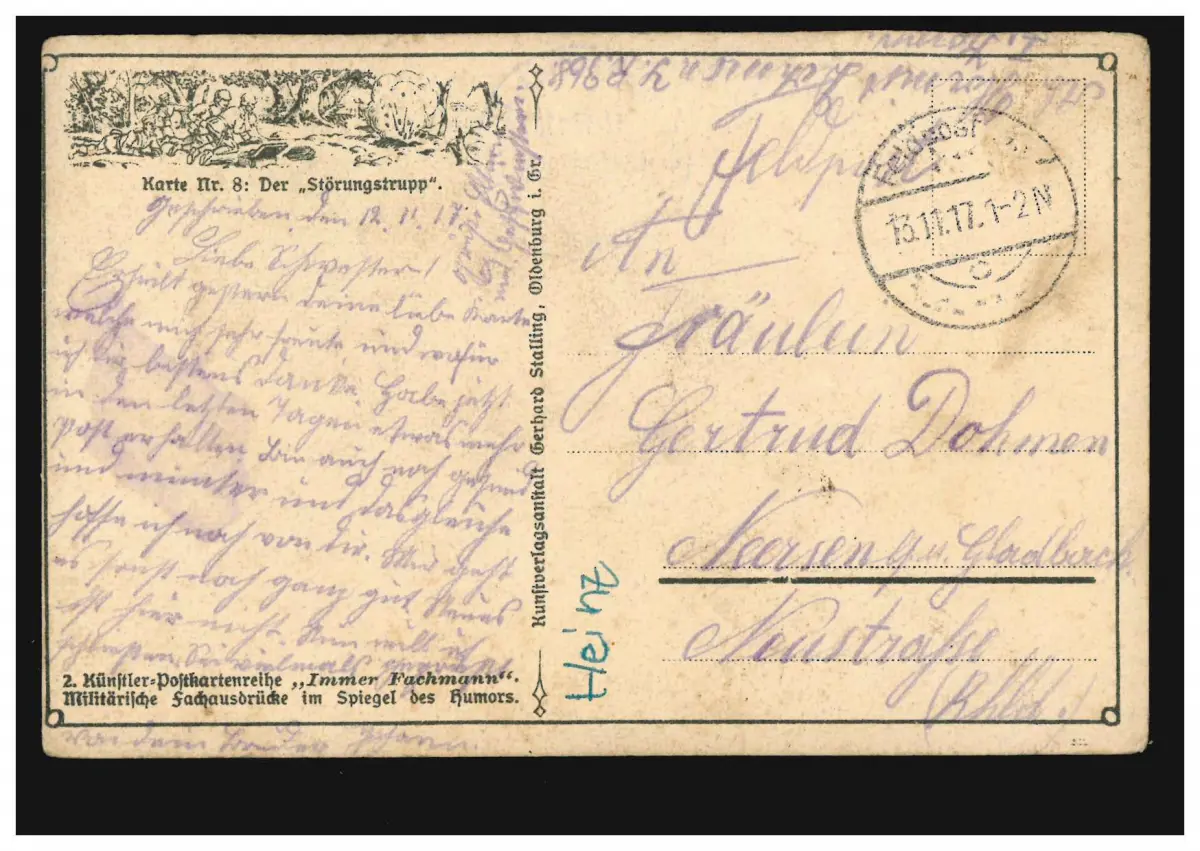 Karikatur-AK Immer Fachmann: Der Störungstrupp, Feldpost mit BS 13.11.1917
