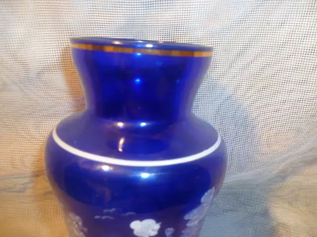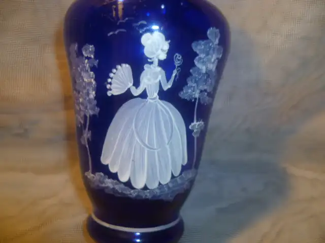 Karlsbad Vase in blauem Glas Schnee Emaille Bemalung in Weiß in Form mundgeblasen um 1970 feine Parkscene mit Dame der Gesellschaft