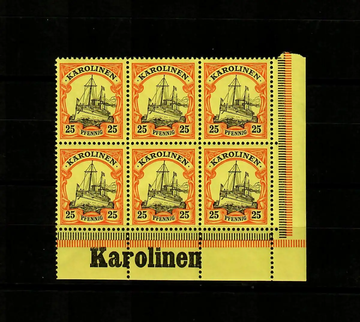 Karolinen: MiNr. 11, vom Eckrand, 6er Block mit Inschrift, postfrisch, **