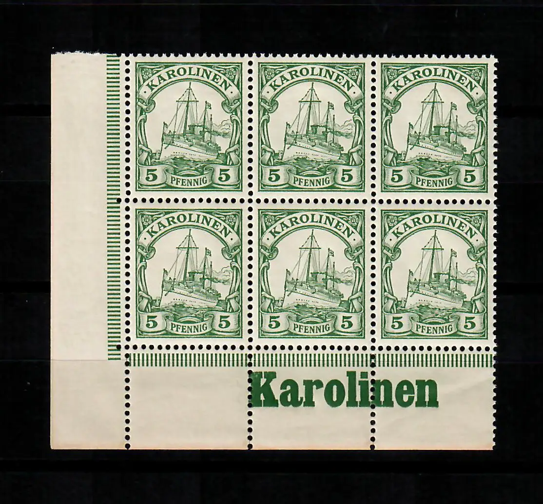 Karolinen: MiNr. 8, vom Eckrand, 6er Block mit Inschrift, postfrisch, **
