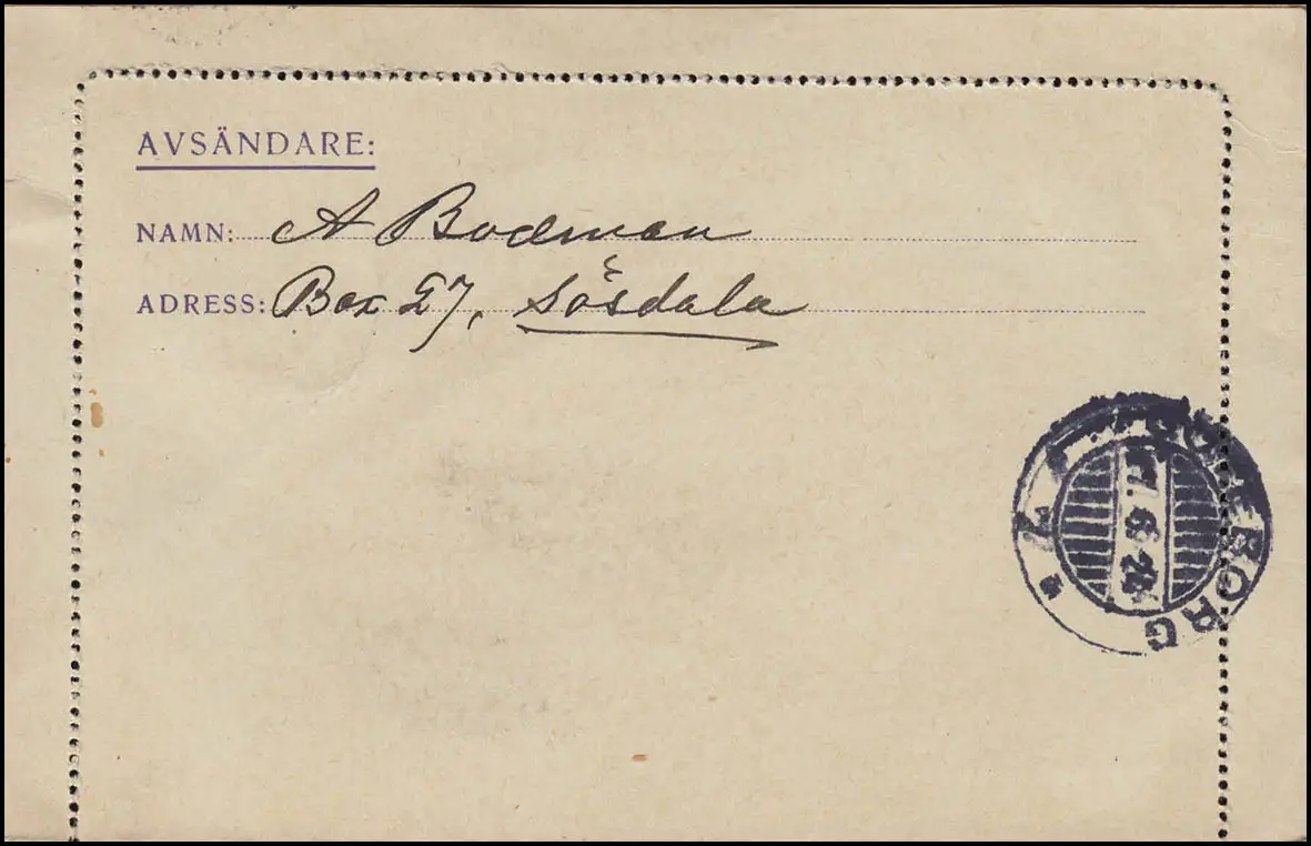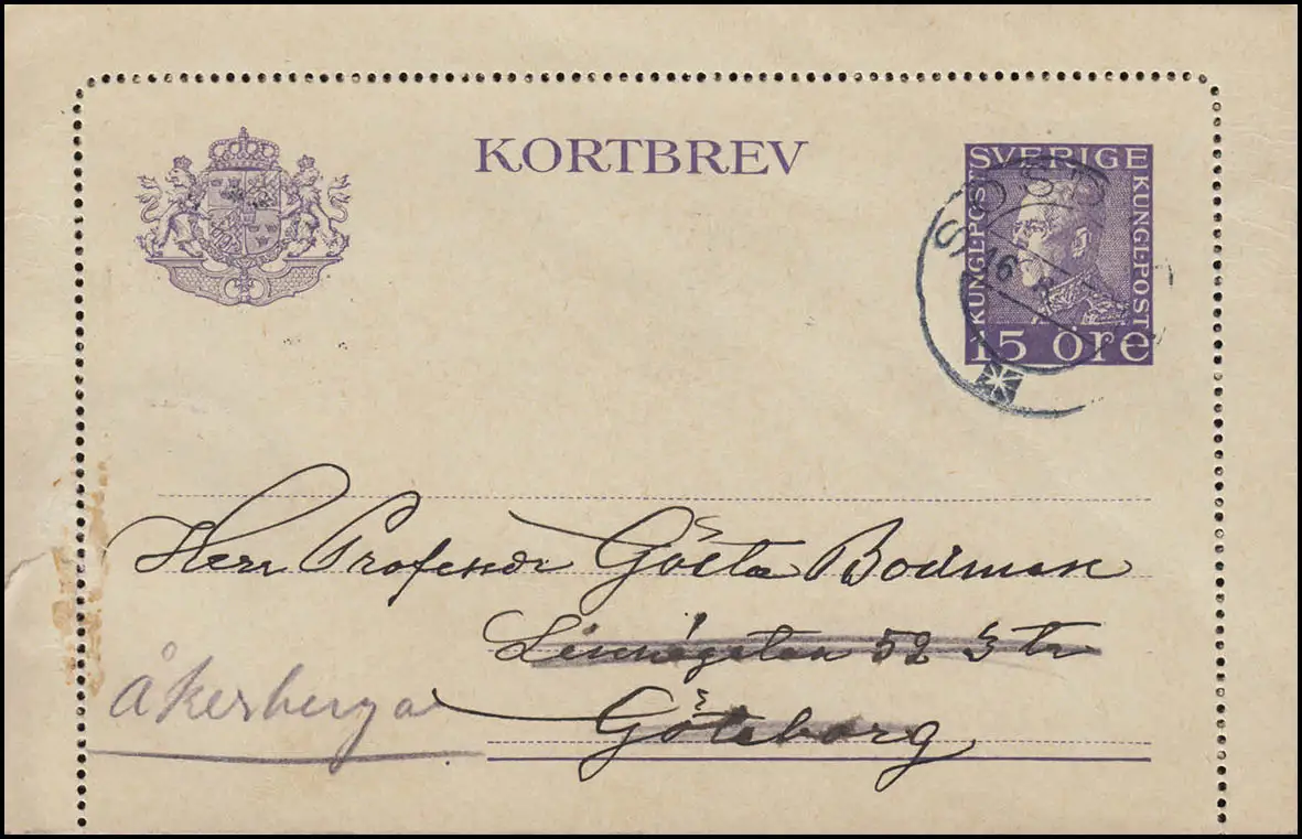 an den Polarfoscher Gösta Bodman, Weiterleitung aus GÖDEBORG 17.6.24 - Adressenkorrektur nach Akesberga