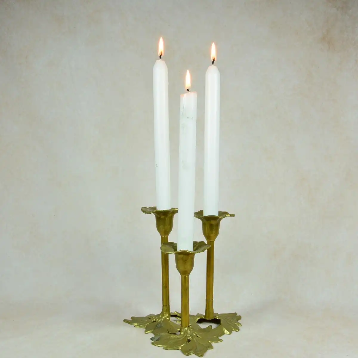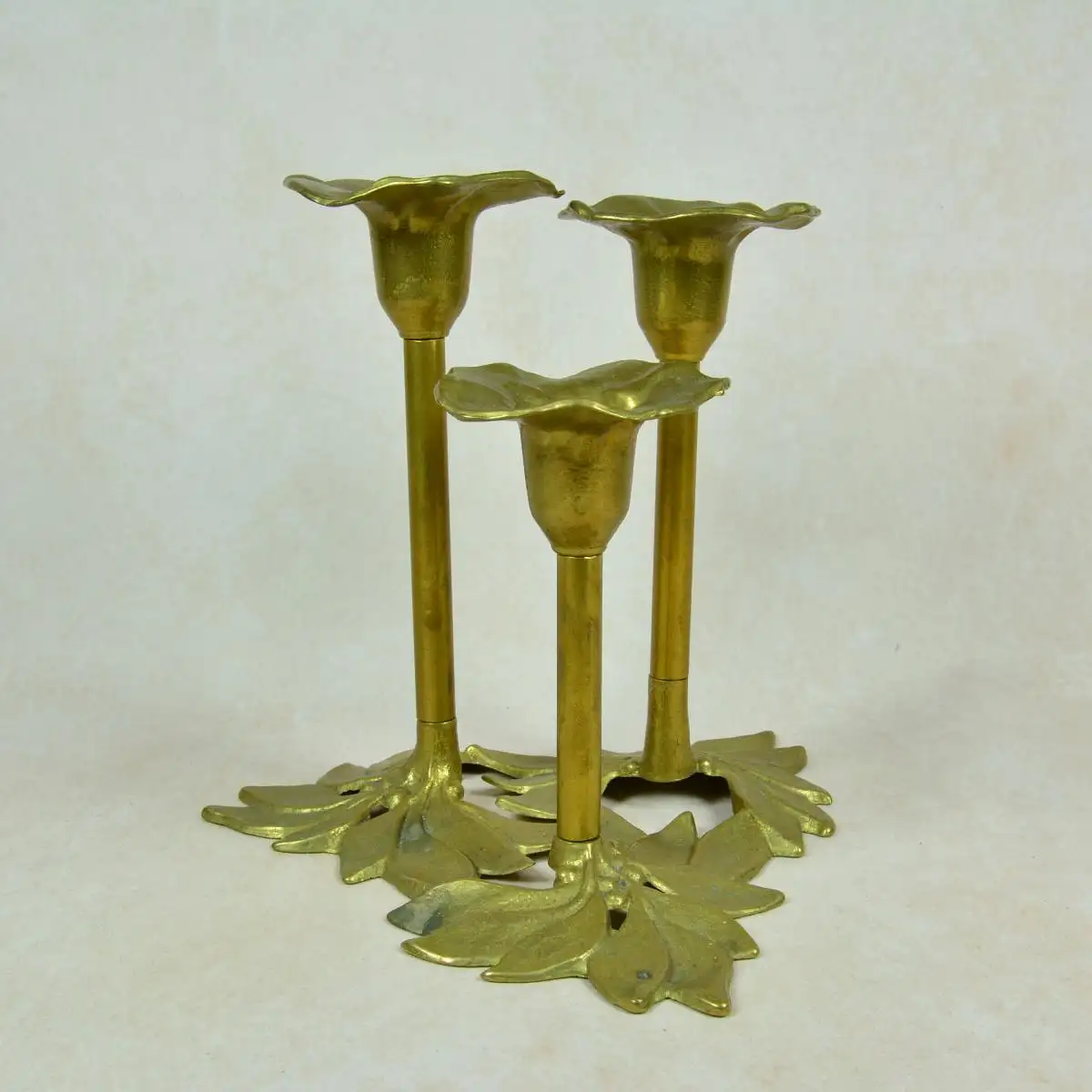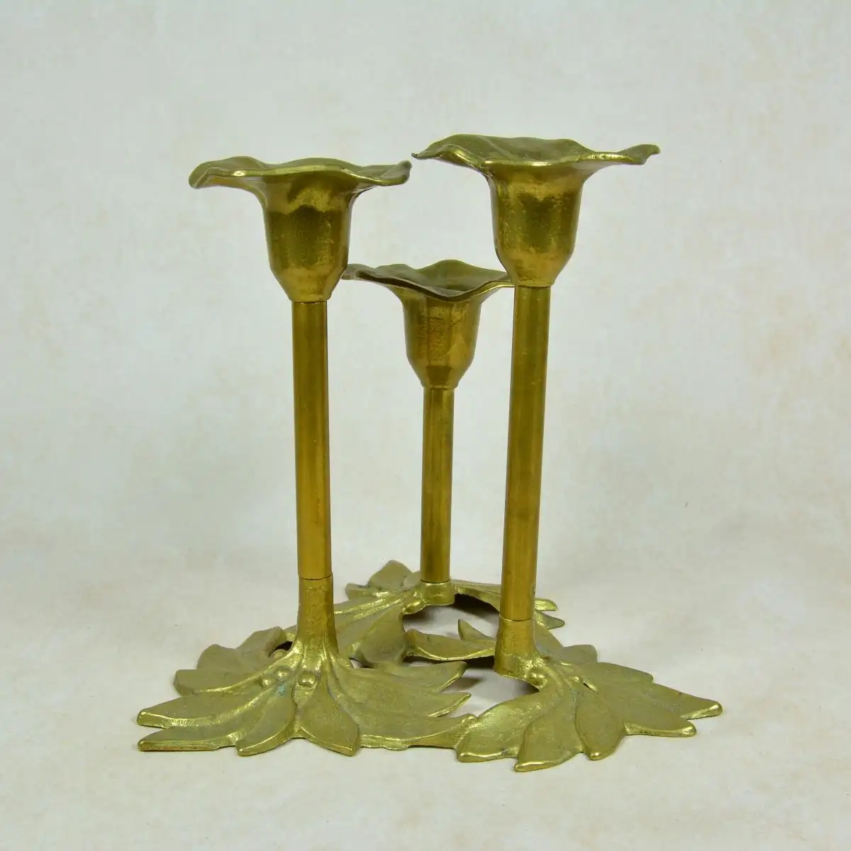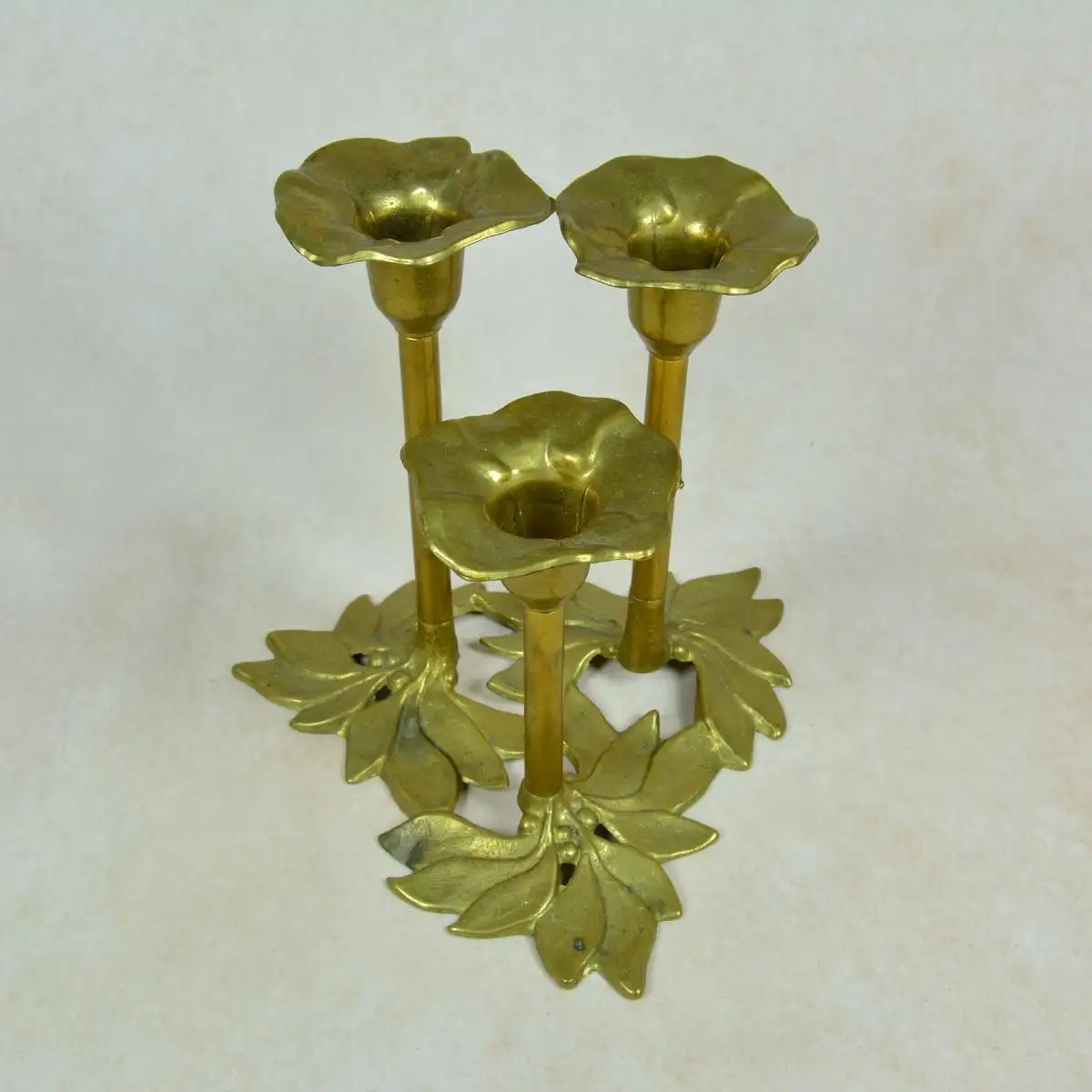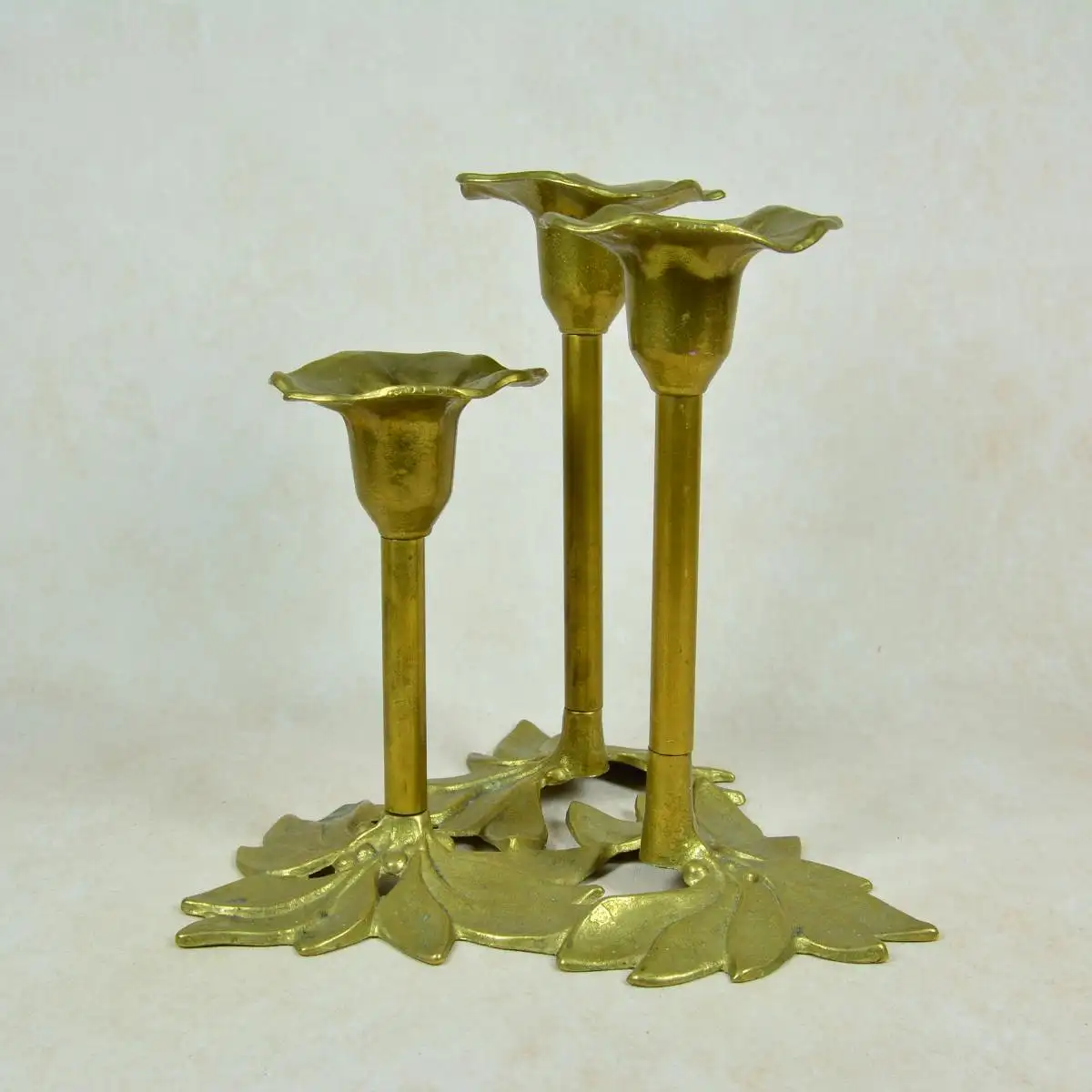 Messing-Kerzenständer mit drei blumenförmigen Haltern auf einem Blatt-Sockel, Mitte 20. Jahrhundert. Sehr guter Zustand mit geringer Patina. Ideal für Sammler von Vintage-Beleuchtung oder als dekorativer Akzent im Zuhause.