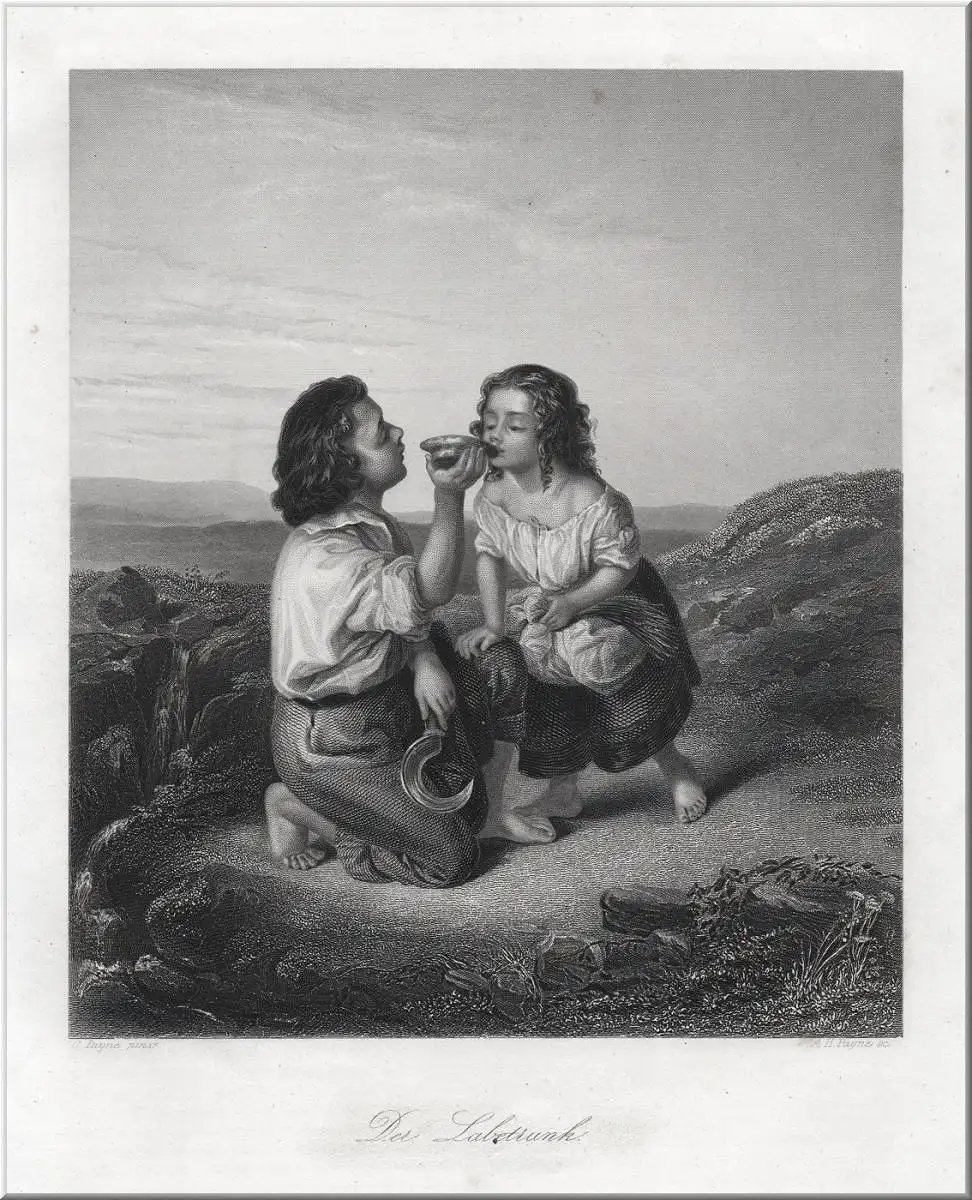 Kinder: Der Labtrunk. Originaler Stahlstich, gestochen von Payne um 1850