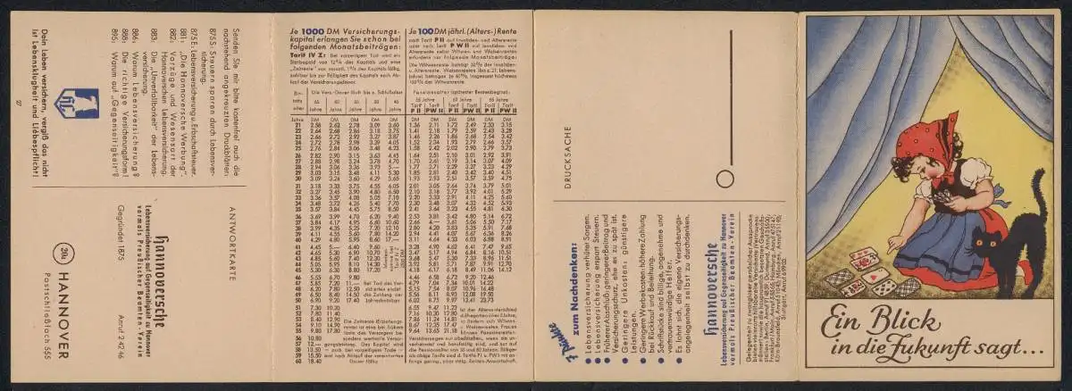Klapp-AK Kleines Mädchen legt Karten neben ihrer schwarzen Katze, Werbeprospekt der Hannoverschen Lebensversicherungen