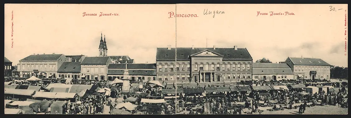 Klapp-AK Pancsova, Franz Josefs-Platz mit Markt