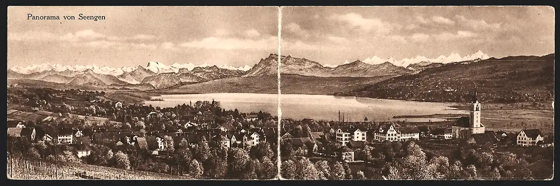 Klapp-AK Seengen, Panorama mit Kirche gegen Berge und See