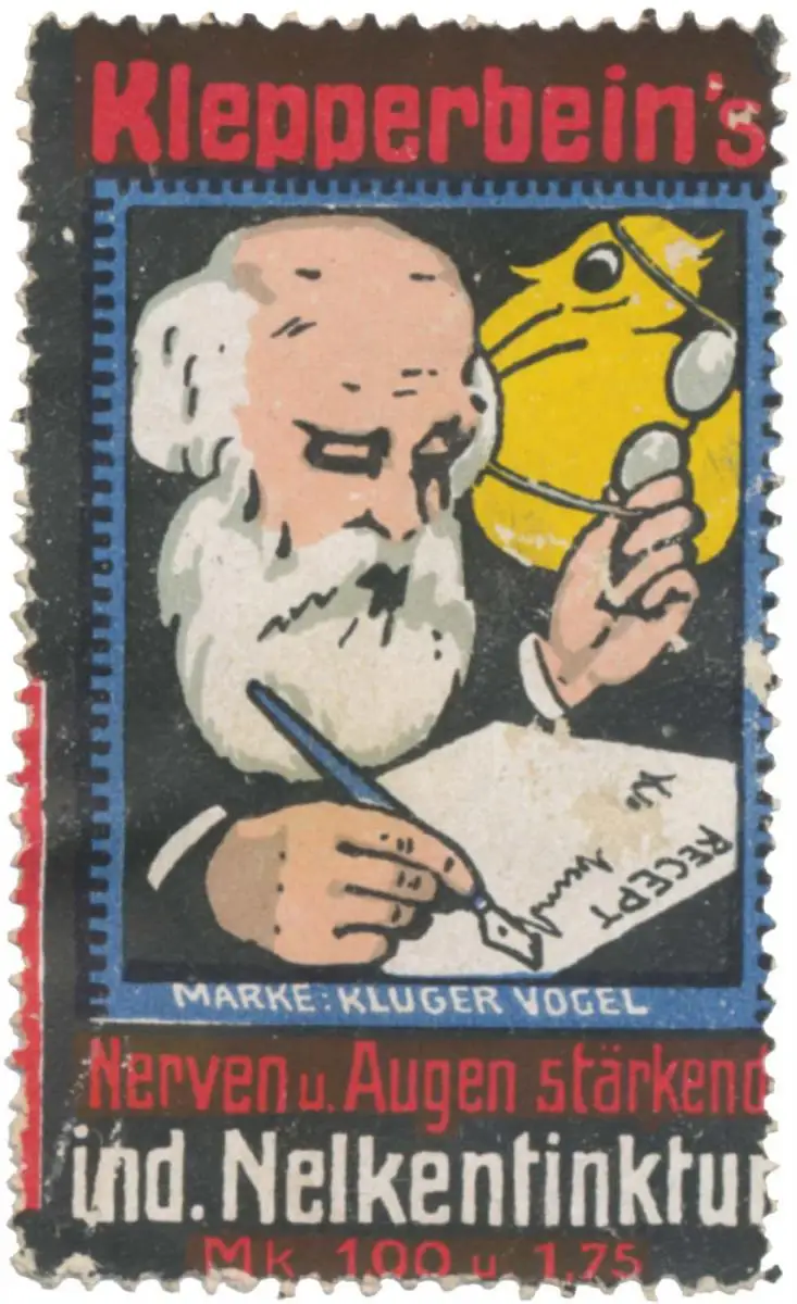 Marke: Kluger Vogel, Nerven und Augen stärkend, Druck: Ed. Zeppernick, Dresden, Größe/Zustand: 6x3 , Fehldruck, leicht beschädigt, Original alte Reklamemarke die seinerzeit für die Werbung benutzt wurde