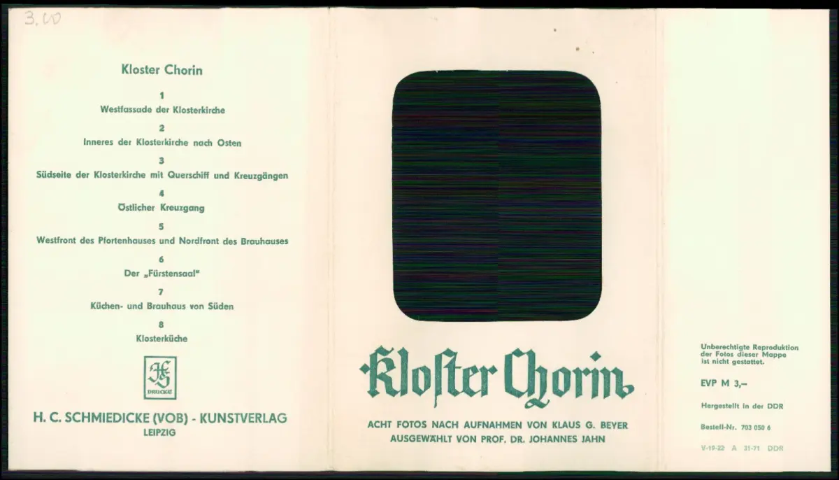 Originale Fotomappe Kloster Chorin, herausgegeben vom H. C. Schmiedicke (VOB) Kunstverlag Leipzig, hergestellt in der DDR (1971). Enthält acht Originalaufnahmen im Format 15x10 cm, nach Fotografien von Klaus G. Beyer, ausgewählt von Prof. Dr. Johannes Jahn.