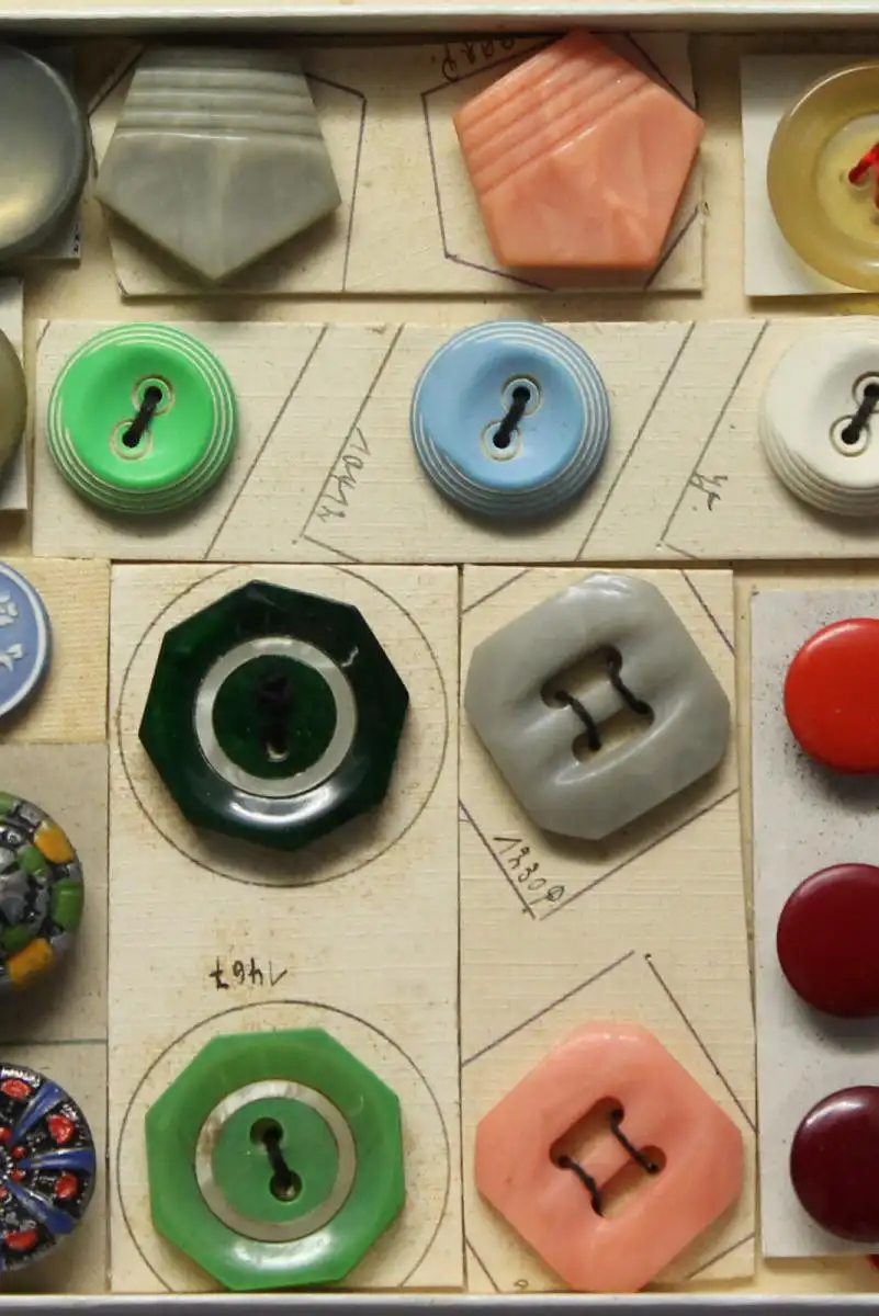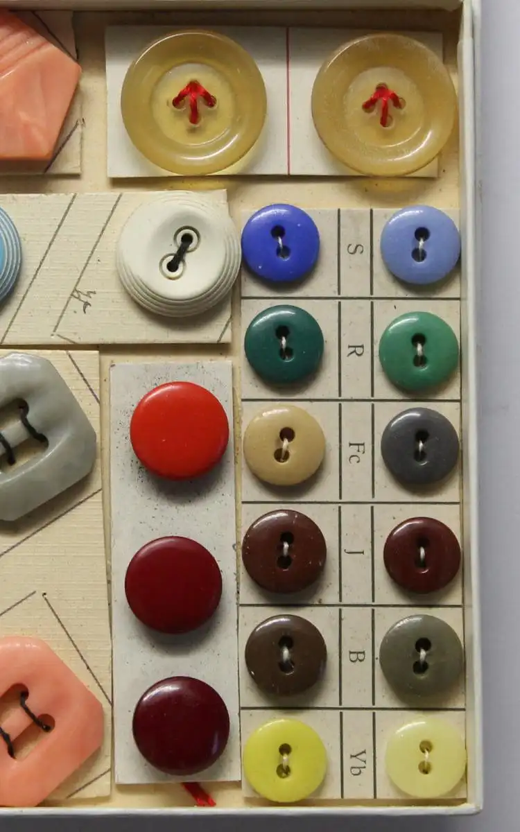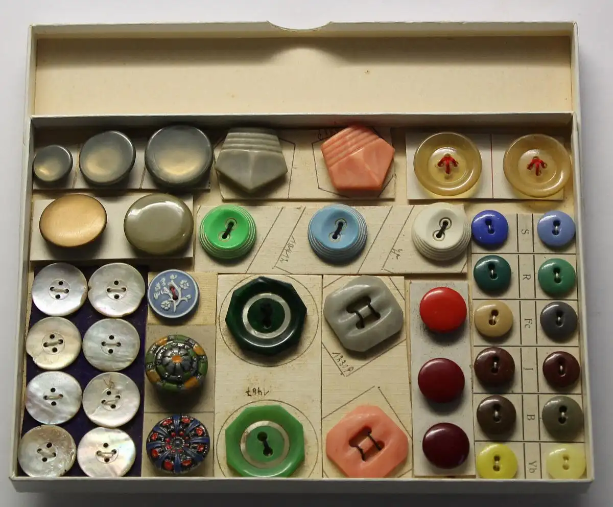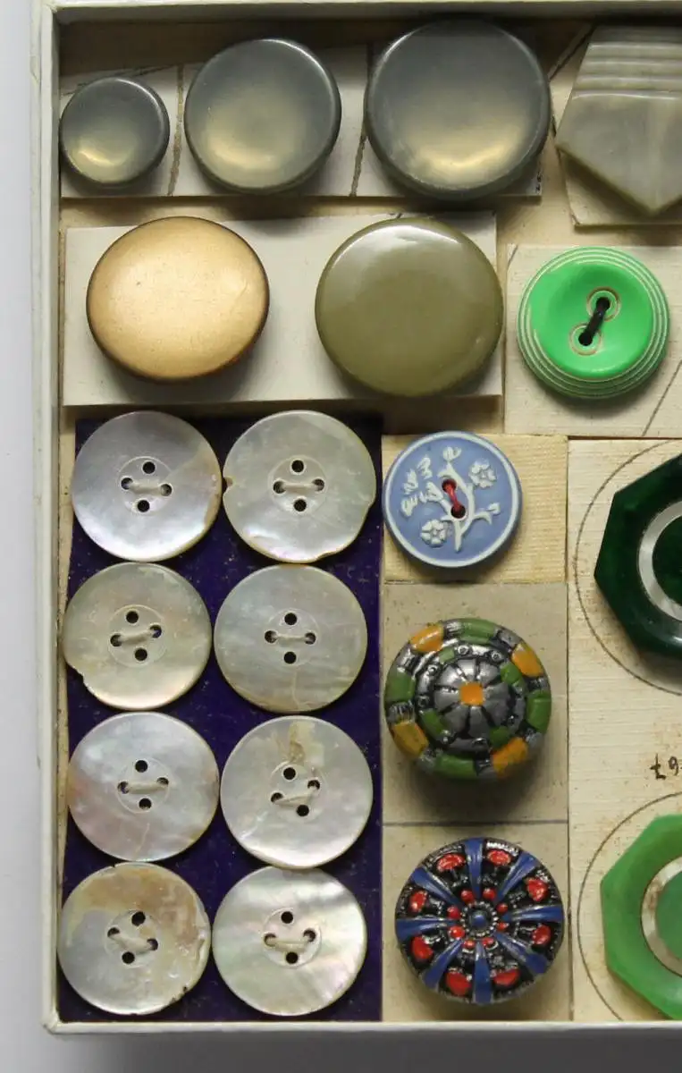 Zustand:Knöpfe in sehr gutem Zustand, wenige etwas angebräunt. Pappschachtel vereinzelt leicht braunfleckig.