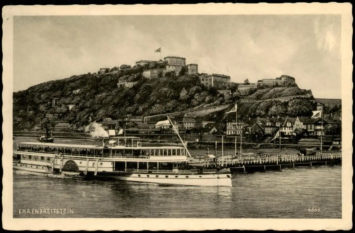 Koblenz Rhein Dampfer Fahrgastschiff passiert Festung Ehrenbreitstein 1930