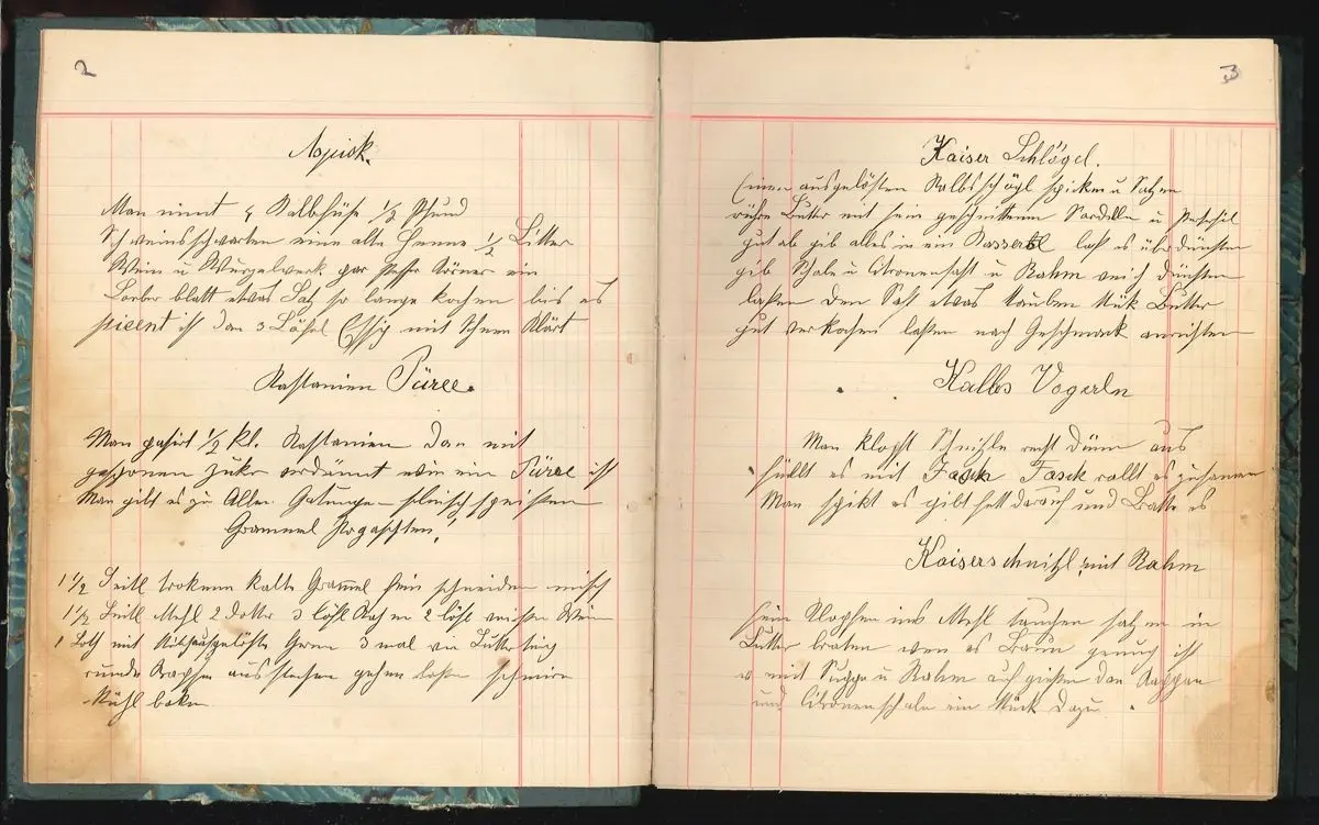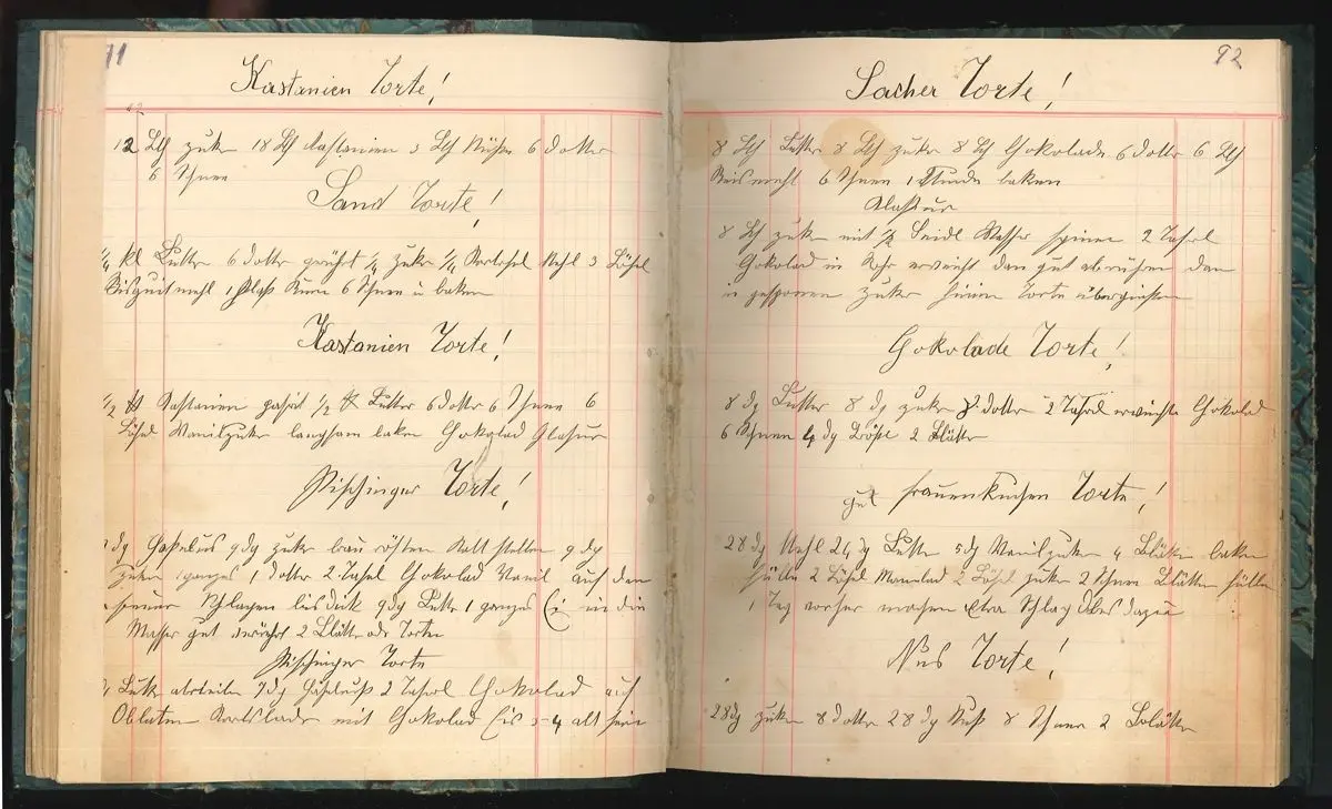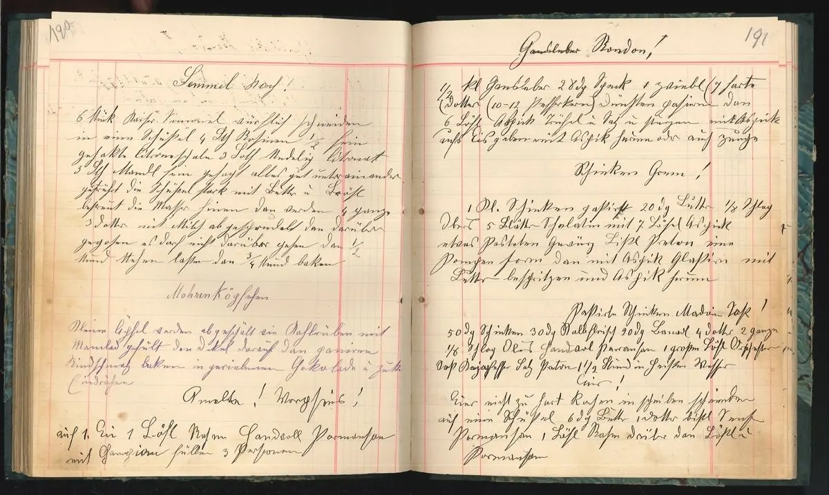 Bemerkungen: Umfangreiche Sammlung verschiedenster Rezepte hauptsächlich für Süßspeisen wie "Kastanien Pürée, Kalbs Vogerln, Cotelette a` la Sacher, Spanferkel, Indianer Krapfen, Salzburger Nokerl, Pischinger Torte, Napoleon Schnitten, Makronen u.v.a.