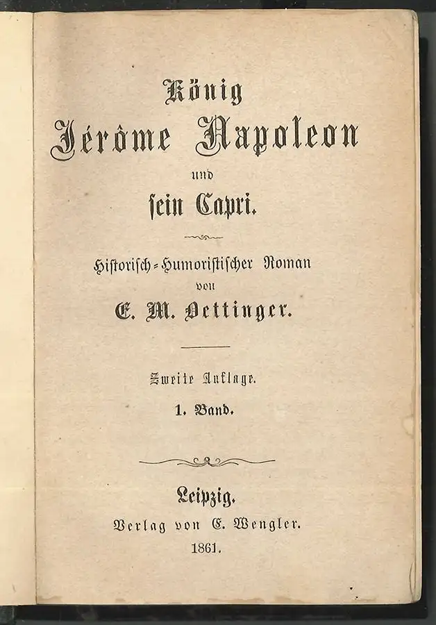 Bemerkungen: Zweite Auflage des erstmals 1851 erschienenen, 3-teiligen Romans von Eduard Maria Oettinger (1808-1872) über Jérôme Bonaparte (1784-1860).