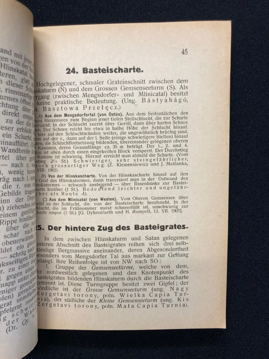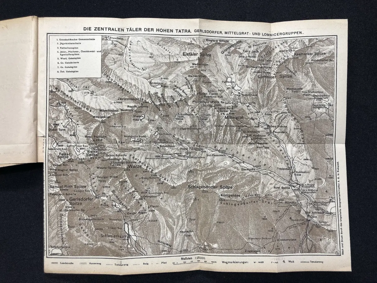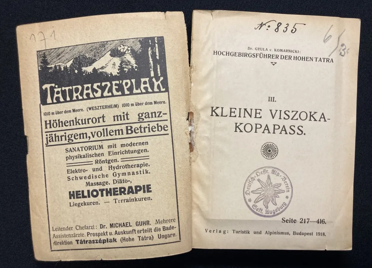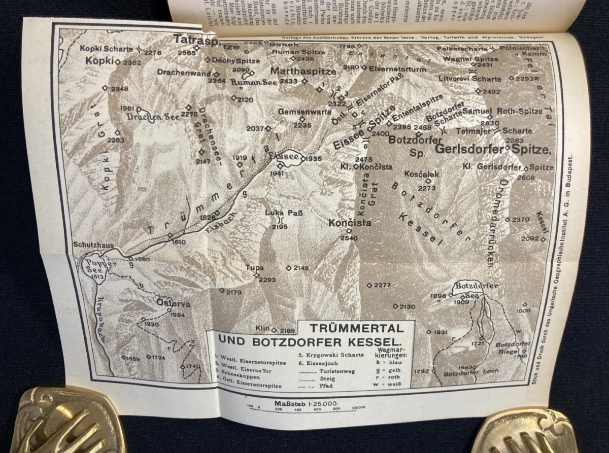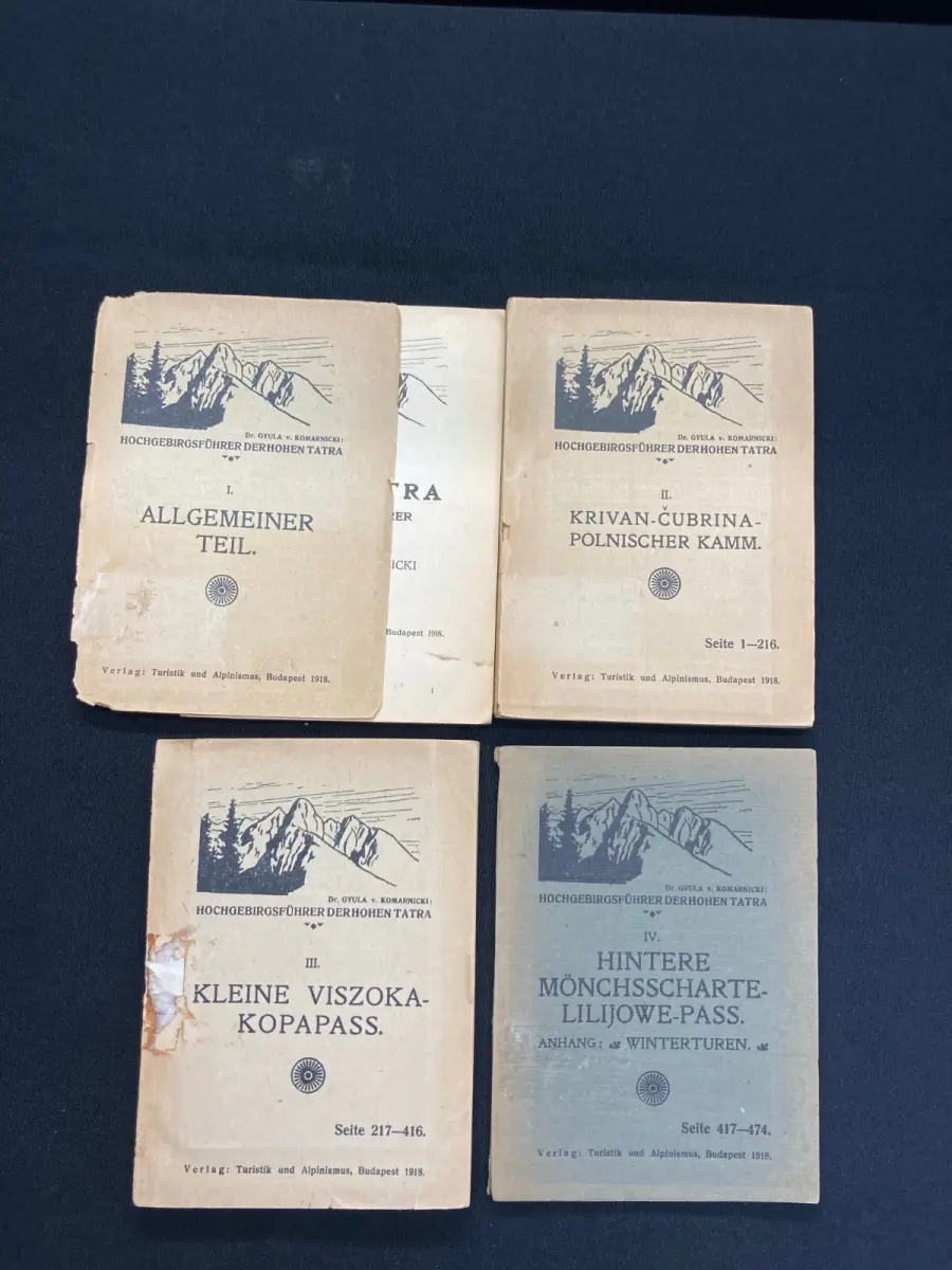 Schöne sehr seltene komplette reihe von Dr. Komarnicki über die wunderschöne Tatra. Bd.1: Vorderer Deckel lose und leicht randrissig, Vorsatz. Titel und vereinzelte Seiten mit Stempel der ehemaligen Bergsteigergruppe des Alpenverein. Papier gering gebräunt.Bd.2: Vorderer Deckel zum dreiviertel lose, Papier gering gebräunt, alle Karten sowie einige Seiten mit dem Stempel der ehemaligen Bergsteigergruppe des Alpenverein. Bd.3: Einband vorn und hinten mit Kleberesten, vorderer Deckel zum dreiviertel lose. Titel mit Stempel des ehemaligen Alpenvereins und beschrieben. Papier gering gebräunt. Bd.4:Einband lichtrandig, Rücken mit 2 kleinen Einrissen oben und unten, Papier gering gebräunt und vereinzelt mit Stempel der ehemaligen Bergsteigergruppe des Alpenverein. Schöne Exemplare dieses sehr seltenen Titels