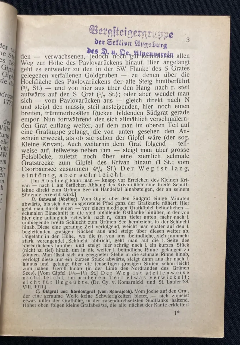 Teil 1:Vorderer Deckel lose und leicht randrissig, Vorsatz. Titel und vereinzelte Seiten mit Stempel der ehemaligen Bergsteigergruppe des Alpenverein. Papier gering gebräunt.,Teil 2:Vorderer Deckel zum dreiviertel lose, Papier gering gebräunt, alle Karten sowie einige Seiten mit dem Stempel der ehemaligen Bergsteigergruppe des Alpenverein, Teil 3:Einband vorn und hinten mit Kleberesten, vorderer Deckel zum dreiviertel lose. Titel mit Stempel des ehemaligen Alpenvereins und beschrieben. Papier gering gebräunt., Teil 4:Einband lichtrandig, Rücken mit 2 kleinen Einrissen oben und unten, Papier gering gebräunt und vereinzelt mit Stempel der ehemaligen Bergsteigergruppe des Alpenverein.