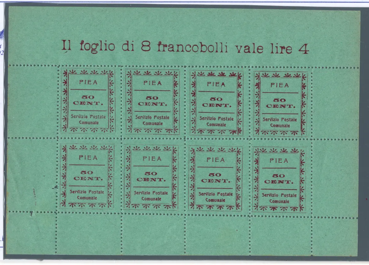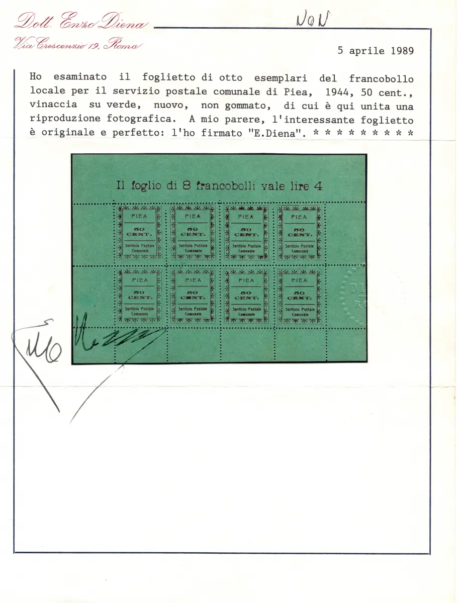 M - ohne Gummi - Kommunale Post von Piea (Kat. Einheit Nr. 5) Bogen mit acht Exemplaren neu perfekt - Selten, extrem unterbewertet aus dem Einheitskatalog - Zertifikat Enzo Diena ausführlich signiert - Kat. euro 1200 Cod. 2890/WEB