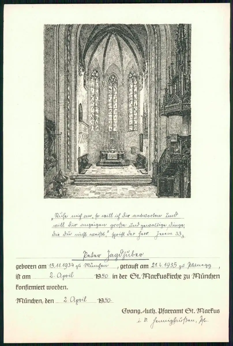 Konfirmation-Urkunde 30x20 Radierung Inneres der St. Markus Kirche München 1950