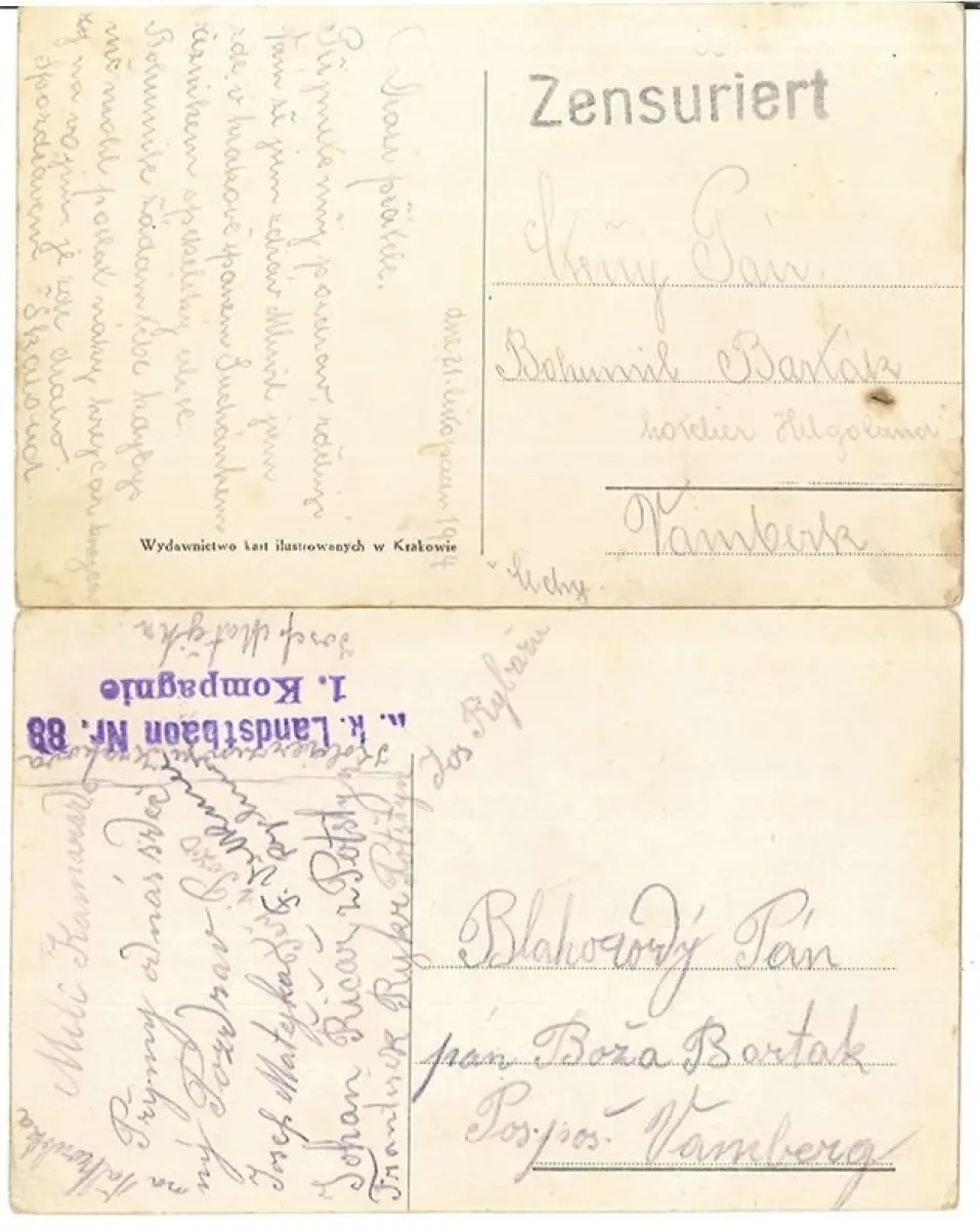 Bemerkungen: Konvolut von 2 s/w Ansichtskarten mit Ansichten von Krakau, gelaufen Krakau - Vamberk, gestemp.: "Zensuriert", bzw. "k. k. Landstbaon Nr. 88 1. Kompanie", ohne Marken.
