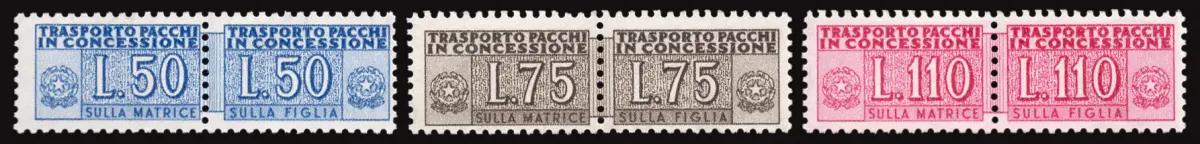 MNH - Vollgummi - Pakete Konzession Nr. 2/I-4/I Serie mit drei geraden filigranen Werten von ausgezeichneter Qualität, mittelmäßige Zentrierung für 50 Lire, sehr gut 75 und 110 - Kat. euro 500 Cod. 409/17