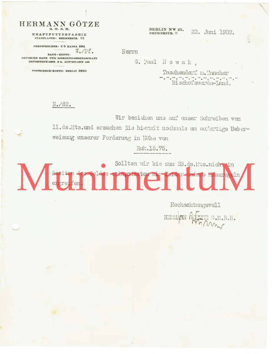 Kraftfutterfabrik Hermann Götze BERLIN Bremerstr. | Rechnung 1932