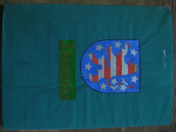 4° ( 29,5 x 21 cm). Grüner OriginalLeinenband, vom Autor eigenhändig eingebunden, mit von Hand coloriertem farbigen Thüringer Wappen auf dem Vorderdeckel sowie kleiner, montierter Fahne am oberen Rücken. Das Leinen ist an Ecken und Kanten knapp beschnitten, leicht wellig und vereinzelt schwach fleckig, mit kleinem Kleberest oben am Vorderdeckel. Montiertes ExLibris des Autors im vorderen Innendeckel. Handgeschriebenes Titelblatt in Fraktur. Montierte mehrfarbige Karte des Landes im hinteren Innendeckel. Die Seiten sind nicht paginiert, tragen nur handschriftliche Kapitelnummern. Etwa 210 Seiten mit maschinenschriftlichem Text und insgesamt 420 handkolorierten Wappen (1 - 9 pro Seite), jeweils maschinenschriftlich betitelt. Die Titelseiten zum jeweiligen Kreis wurden dagegen von Hand beschriftet, unter Verwendung verschiedener Schriftarten. Auf mehreren Seiten Korrekturen mit TippEx, vereinzelt mit winzigen Abfärbungen auf die Wappenzeichnungen. Die dort verwendeten Farben sind teilweise geringfügig (bis zu 1 mm) verwischt bzw. verlaufen. Insgesamt noch gut erhaltenes Unikat