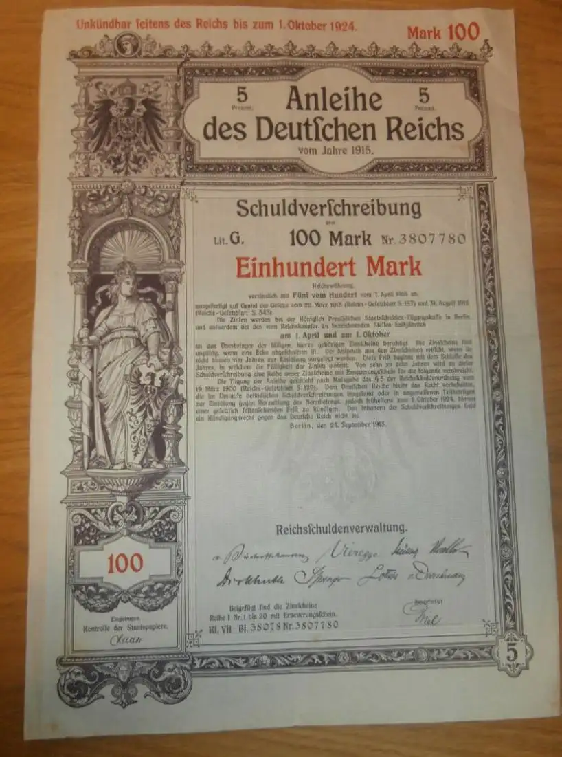 Kriegsanleihe - Schuldverschreibung , Einhundert Mark , Deutsches Reich 1915 , Anleihe !!AZR-WR