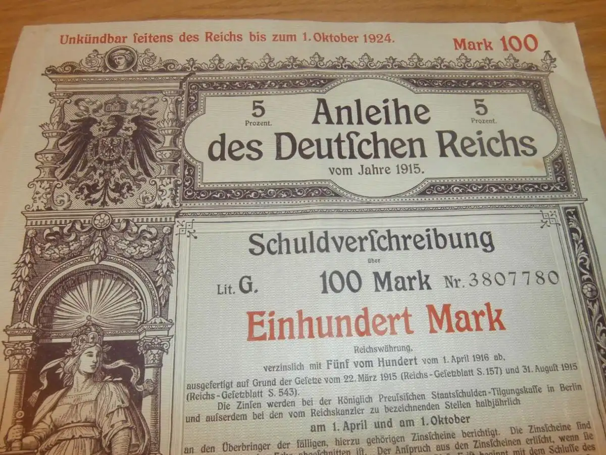 Kriegsanleihe - Schuldverschreibung , Einhundert Mark , Deutsches Reich 1915 , Anleihe !!