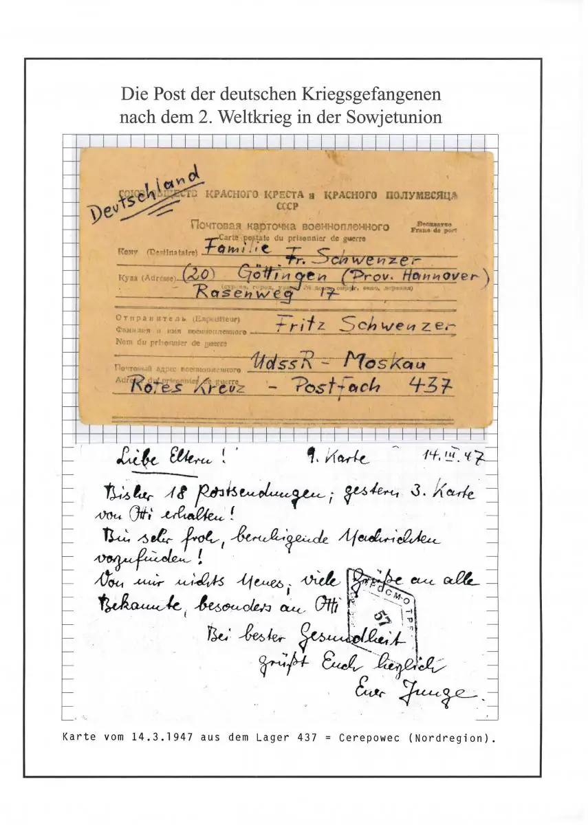 Kriegsgefangenenpost Lager 437 Tscherepowez UdSSR nach Göttingen vom 14.3.1947