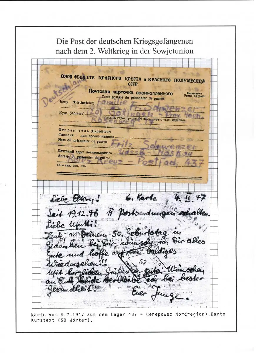 Kriegsgefangenenpost Lager 437 Tscherepowez UdSSR nach Göttingen vom 4.2.1947