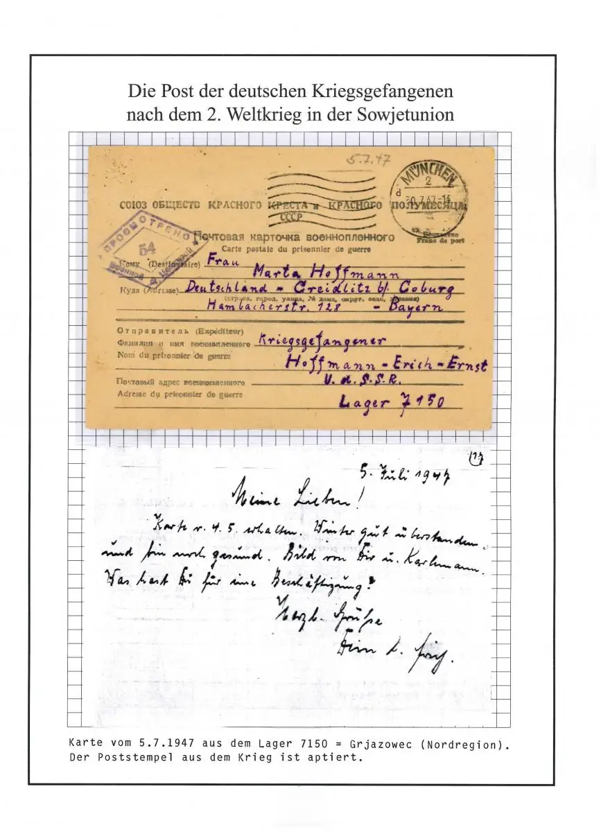Kriegsgefangenenpost Lager 7150 Grjasowez UdSSR nach Creidlitz München 30.7.1947