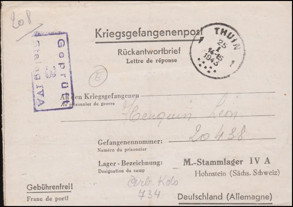 aus THUIN 25.1.1943, Briefstempel "Geprüft 3 Stalag IV A"