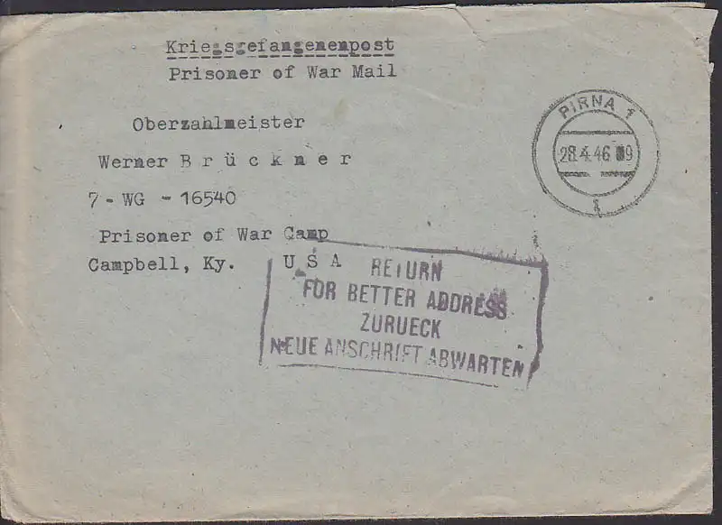 Kriegsgefangenpost Pirna 28.4.46 nach USA, R4 zurück neue Anschrift abwarten
