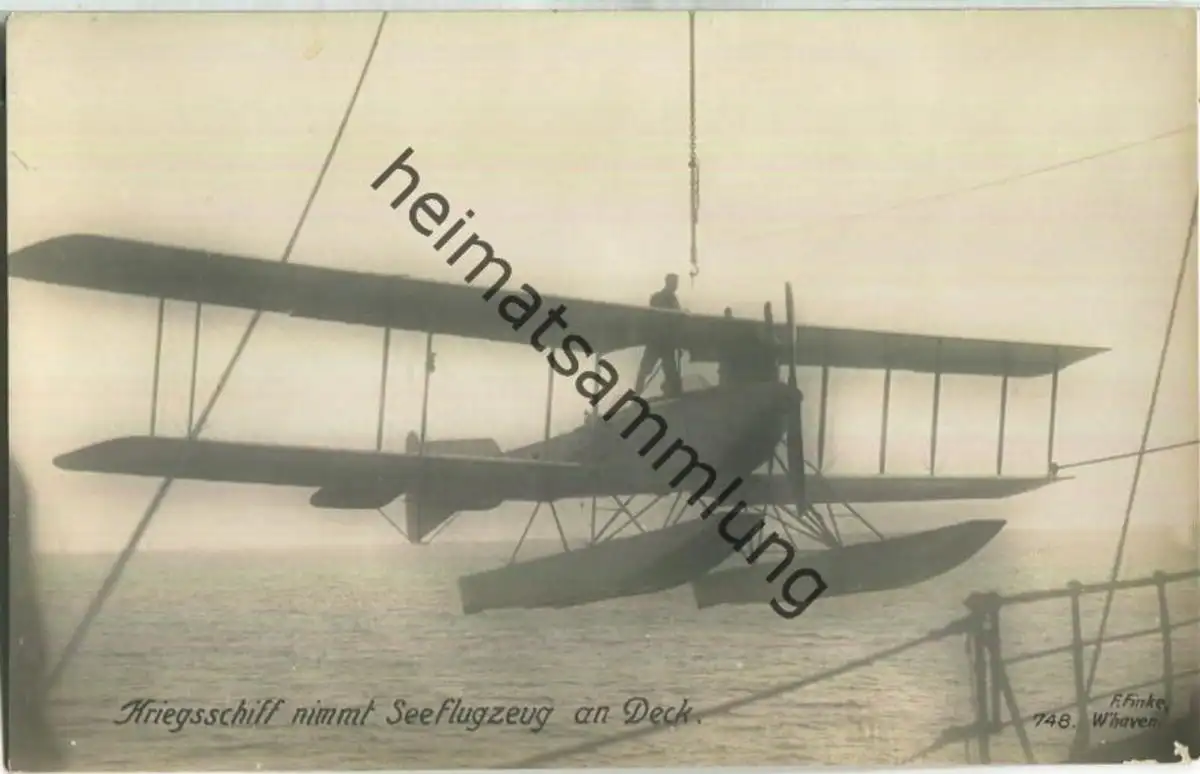Kriegsschiff nimmt Seeflugzeug an Bord - Foto-Ansichtskarte ca. 1915 - Verlag F. Finke Wilhelmshaven