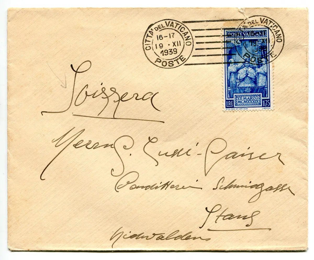 Krönung SS Pius XII Lire 1,25 isoliert auf Auslandsumschlag Umschlag - Krönung SS. Pius XII Lire 1,25 Nr. 71 isoliert auf Umschlag für die Schweiz - Umschlag ohne Ankunftsstornierung wie üblich für den ordentlichen Direktversand ins Ausland Katalog 0 Cod.1187/WEB