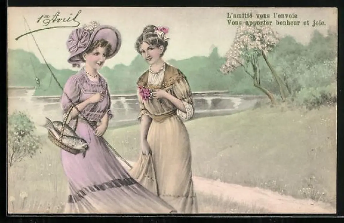 Künstler-AK 1er Avril, Zwei Frauen mit einem Korb mit Fischen, L`amitie vous l`envoice...