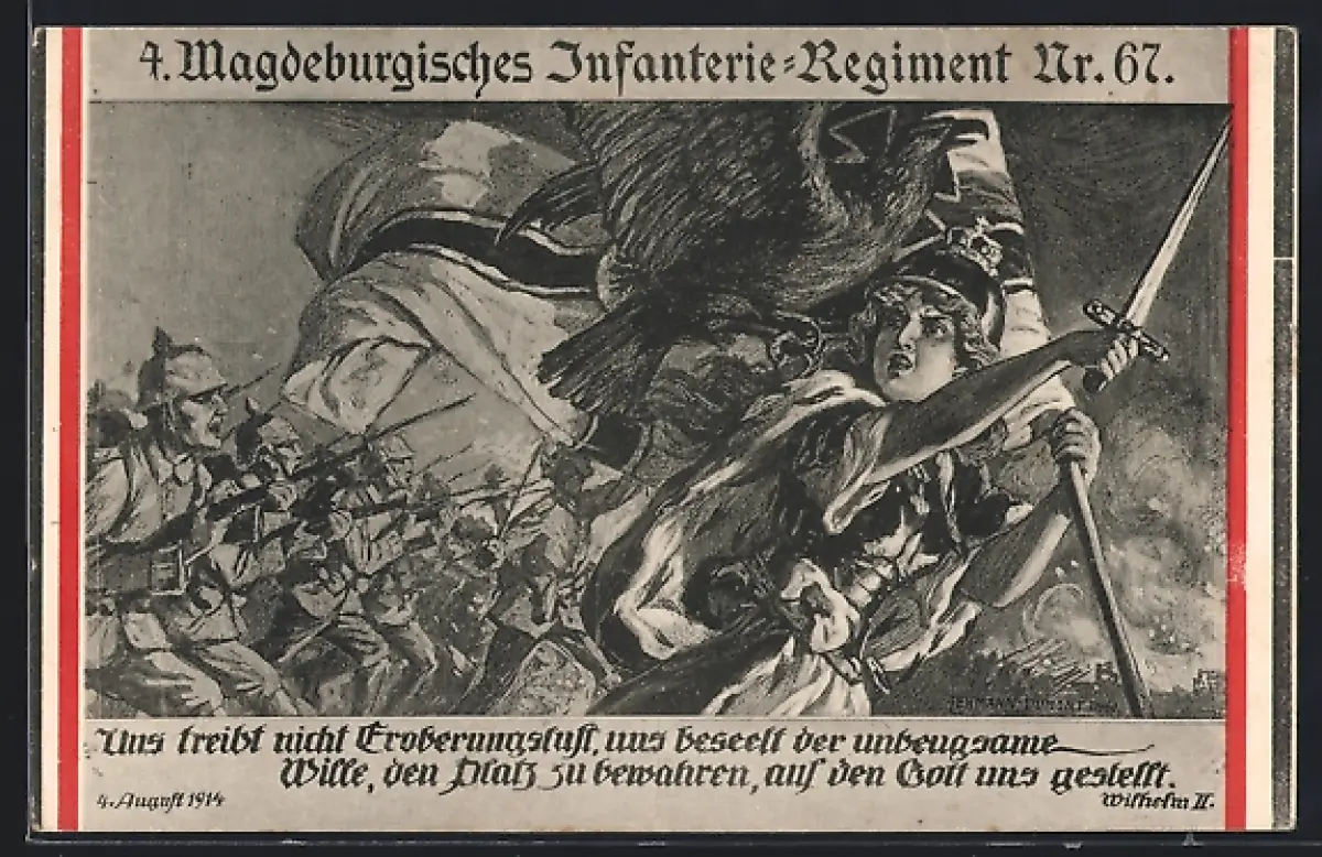 Künstler-AK 4. Magdeburgisches Infanterie-Regiment Nr. 67 im Sturm mit Germania, Nationalfarben-Banderolen