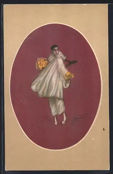 Künstler-AK A. Zandrino: Harlekin mit Blumen