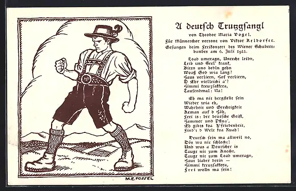 Künstler-AK A deutsch Trutzgsangl von Maria Vogel, Junger Mann in Lederhosen
