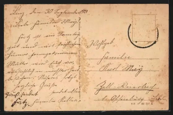 Personenbezogene Daten auf der Rückseite der Karte wurden durch blauen Textmarker unkenntlich gemacht. Die blauen Stellen sind auf die Vorderseite durchgeweicht und wirken sich negativ auf das Postkartenfoto aus