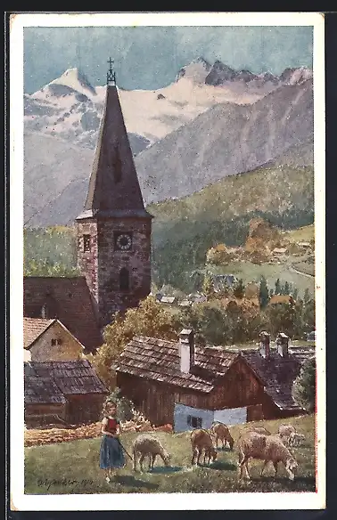 Künstler-AK Alt-Aussee, Teilansicht mit Kirche, Mädchen mit Schafherde auf der Weide
