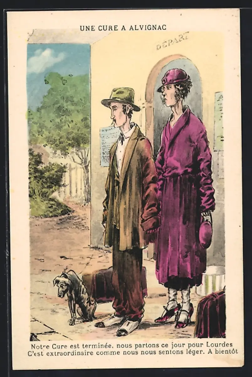 Künstler-AK Alvignac, Une cure à Alvignac, départ pour Lourdes après une cure réussie