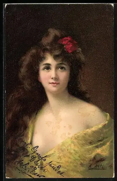 Künstler-AK Angelo Asti: charmant blickendes Fräulein mit roter Haarschleife
