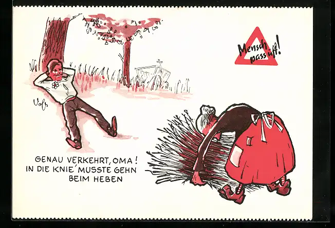 Künstler-AK Arbeitsschutz, Der Enkel gibt seiner Grossmutter Tipps fürs schwere Heben
