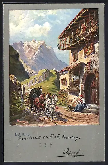 Künstler-AK Arco, Pferdekutsche kommt in der Stadt an