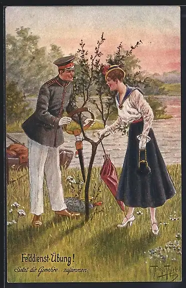 Künstler-AK Arthur Thiele: Felddienst-Übung!, Paar lässt sich an einem lauschigen Plätzchen nieder