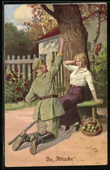Künstler-AK Arthur Thiele unsign.: Die Attacke, Soldat in Uniform kniet vor einer jungen Dame