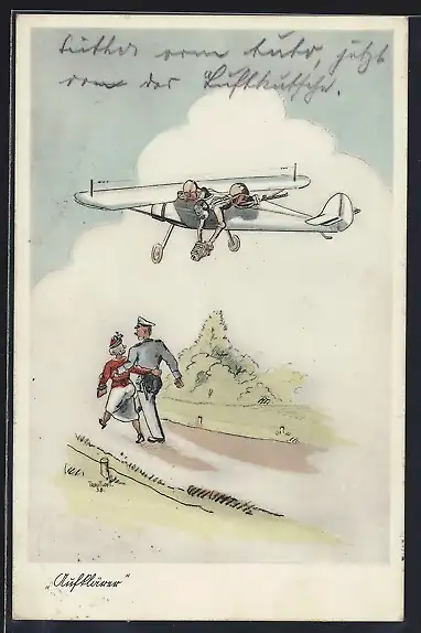 Künstler-AK Aufklärer-Flugzeug fliegt über ein spazierendes Paar
