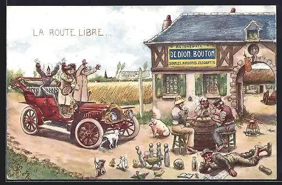 Künstler-AK Auto, Rotes Cabrio auf der Route Libre, erreicht eine Gaststätte