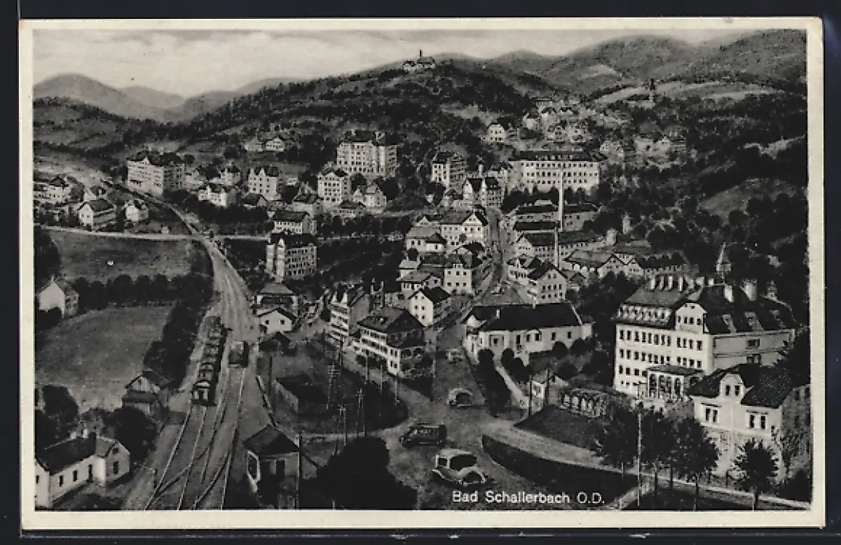 Künstler-AK Bad Schallerbach /O. D., Teilansicht mit Bahn